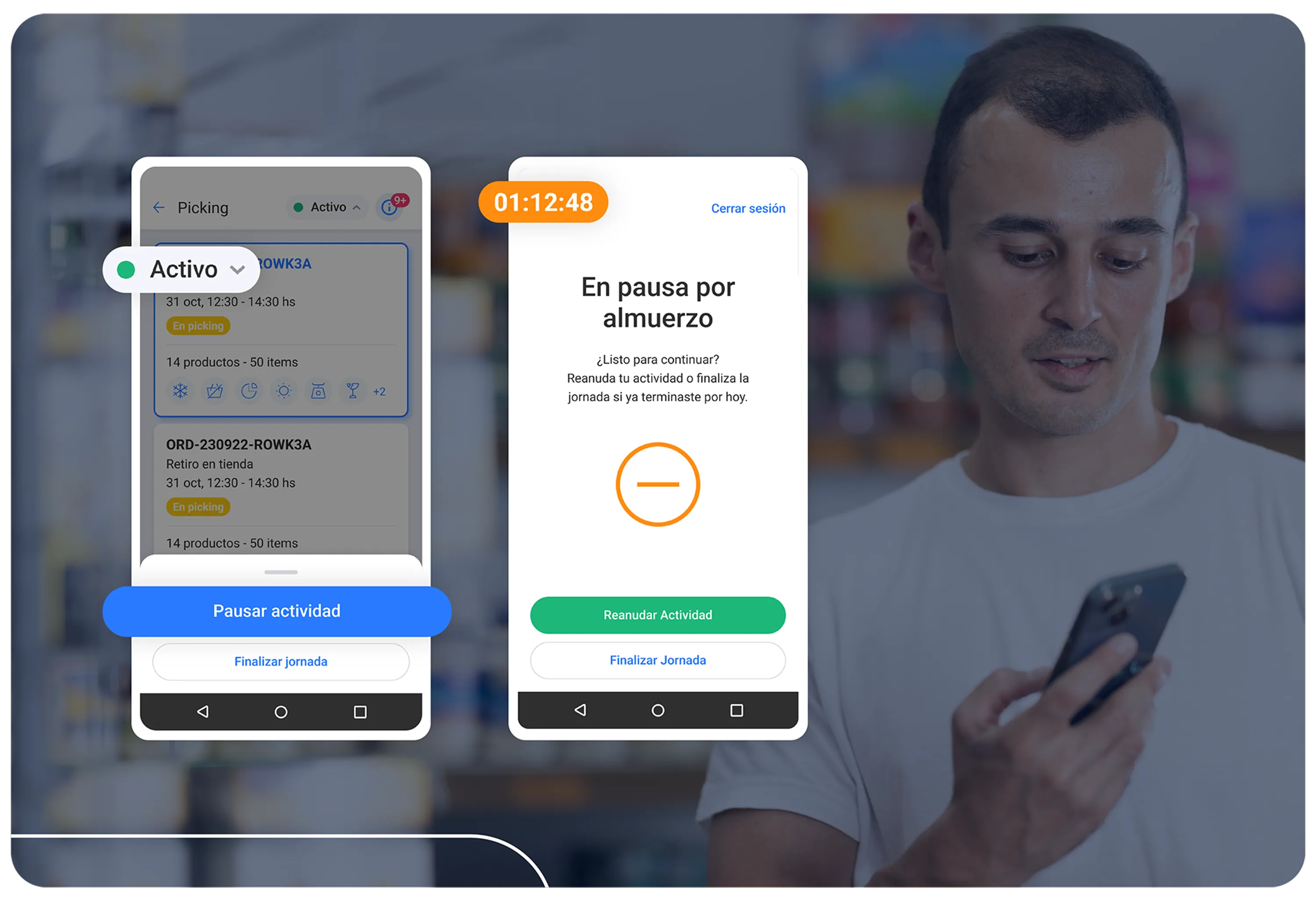 Ahora puedes registrar el inicio y fin de jornada de los pickers, clasificar las pausas por tipo y visualizar en tiempo real cómo se distribuye el tiempo de trabajo. Esta funcionalidad te permite tomar decisiones basadas en datos y mejorar la eficiencia en cada jornada.